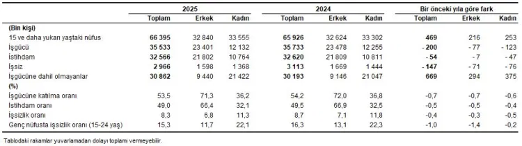 İstihdam edilenlerin sayısı 54 bin kişi azalarak 32 milyon 566 bine düşerken, istihdam oranı 0,5 puan gerileyerek yüzde 49,0 oldu. Bu oran erkeklerde yüzde 66,4, kadınlarda ise yüzde 32,1 olarak hesaplandı. İşgücüne katılma oranı da 0,7 puan azalarak yüzde 53,5 seviyesine indi.