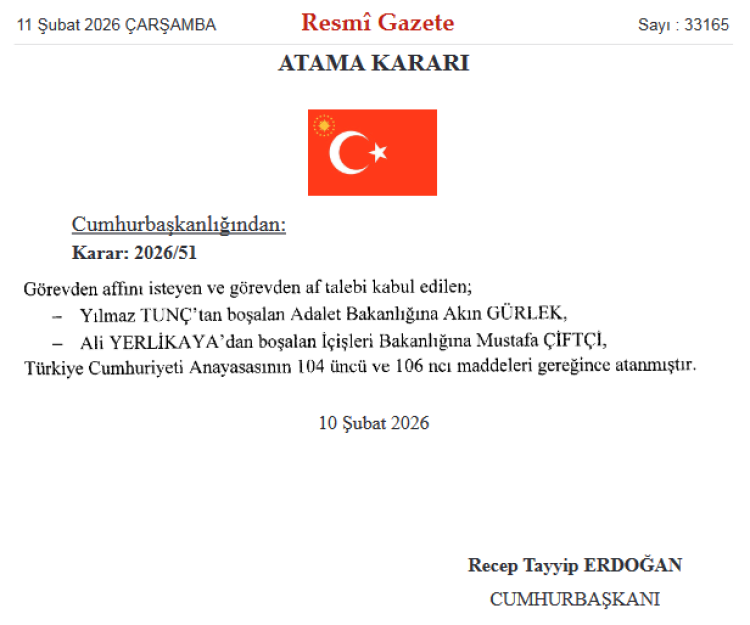 Cumhurbaşkanı Recep Tayyip Erdoğan’ın imzasıyla yayımlanan kararla Adalet ve İçişleri Bakanlıklarında görev değişimi yapıldı.
