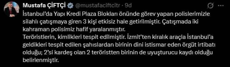 İçişleri Bakanı Mustafa Çiftçi, İstanbul’daki Yapı Kredi Plaza Blokları önünde polisle çatışan 3 kişinin etkisiz hale getirildiğini ve çatışmada iki polisin hafif yaralandığını açıkladı.
