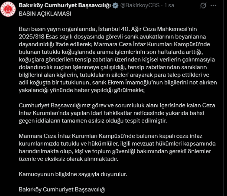 İSTANBUL (İGFA) - Bazı basın organlarında yer alan ve İstanbul 40. Ağır Ceza Mahkemesi 2025/318 Esas sayılı dosyasında görevli sanık avukatlarının beyanlarına dayandırıldığı öne sürülen haberlerde, Marmara Ceza İnfaz Kurumları Kampüsü’ndeki tutuklu koğuşlarında aramaların arttığı, tensip zabıtlarından elde edilen bilgilerle dolandırıcılık girişimlerinde bulunulduğu iddia edilmişti.