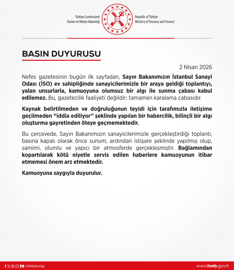 ANKARA (İGFA) - Hazine ve Maliye Bakanlığı, Nefes gazetesinin bugünkü sayısında yer alan İstanbul Sanayi Odası (İSO) toplantısına ilişkin habere sert tepki gösterdi. Bakanlık, söz konusu haberin “yalan unsurlar içerdiğini” ve kamuoyunda olumsuz bir algı oluşturmayı hedeflediğini ifade etti.