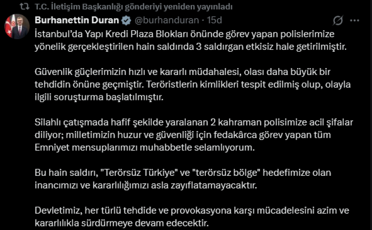 İSTANBUL (İGFA) - İletişim Başkanı Burhanettin Duran, İstanbul’da Yapı Kredi Plaza Blokları önünde güvenlik güçlerimize yapılan hain saldırıya ilişkin açıklama yaptı.