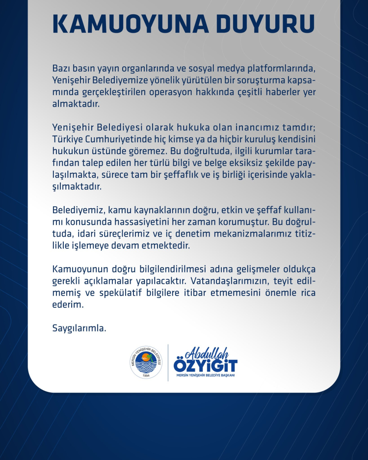 Mersin Yenişehir Belediye Başkanı Abdullah Özyiğit, belediyeye yönelik yürütülen soruşturma kapsamında yapılan operasyonla ilgili açıklama yaparak sürece şeffaflıkla yaklaştıklarını ve hukuka güvendiklerini belirtti.