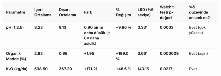 Bilim insanları, bu farkların istatistiksel olarak anlamlı olduğunu vurgularken, özellikle yüksek organik madde ve potasyum değerlerinin uzun süreli organik bir yapının ayrışmasıyla uyumlu sonuçlar verdiğini ifade etti. Araştırma ekibi tarafından yapılan değerlendirmede, “Formasyon içindeki toprak, çevresine göre belirgin şekilde farklıdır. Bu durum, geçmişte burada büyük bir organik yapının bulunmuş olabileceğini düşündürmektedir” ifadelerine yer verildi.