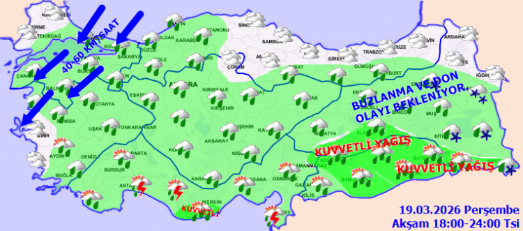 Özellikle Güneydoğu Anadolu’nun büyük kısmı ile Mersin, Adana, Hatay, Osmaniye ve bazı doğu illerinde yağışların yer yer kuvvetli olacağı uyarısı yapıldı. Marmara ve Kuzey Ege kıyılarında ise rüzgarın kuzeyli yönlerden saatte 40-70 kilometre hızla eserek kısa süreli fırtınaya dönüşmesi bekleniyor.